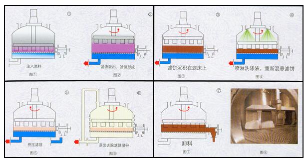 6、清洗徹底:由于此設(shè)備具有自動(dòng)噴淋和重新打漿的功能,濾餅可以得到非常徹底的清洗。并且洗滌液用量較其它類型設(shè)備少,可減少排污量和降低廢水處理費(fèi)用。
